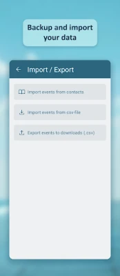 Sündmuste lisamine on imelihtne – importida saad need otse oma seadme kontaktidest või sisestada käsitsi, pakkudes Sulle täielikku paindlikkust. Rakenduse oluline põhimõte on Sinu andmete privaatsus ja turvalisus: kõik sündmused salvestatakse ainult Sinu seadmesse, andmata neid edasi kolmandatele osapooltele. Selleks, et Sinu väärtuslikud andmed oleksid alati kaitstud, on ette nähtud mugav varundusfunktsioon. "Ekspordi CSV-sse" võimaldab luua varukoopia, mis on asendamatu nii seadme vahetusel kui ka lihtsalt andmete turvalisuse tagamisel. Samamoodi saad "Impordi CSV-st" abil andmed kiiresti taastada.